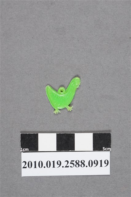 1.本物件為雞尪仔仙。硬質塑膠材質,扁平,單一不透明綠色,雙面浮雕圖案,兩面圖案相同。圖案為簡易型態的站立雞隻,頭部與身體呈現勾型,有雞爪。有小吊環。2.尪仔仙尺寸大致可分成小、中、大型,小型約長2-5公分,中型約長8-15公分,顏色以單色為主。有些大型的則可長達30公分左右,以菩薩、神仙和民間傳說故事人物等造型為主,塗上金銀紅黃彩漆等亮色。1960、70年代的尪仔仙多以民間傳說故事、歌仔戲、布袋戲人物為造型。1980年代改以卡通、電玩、漫畫人物造型為主。常見玩法之一為兩人(或多人)各持一只尪仔仙,輪流用手指彈射,看誰的尪仔仙先疊在對方上面,便可贏得對方用來對戰或是約定的尪仔仙。
