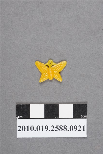 1.本物件為蝴蝶尪仔仙。硬質塑膠材質,扁平,單一不透明黃色,雙面浮雕圖案,兩面圖案相同。圖案為張開翅膀的蝴蝶,軀幹上有橫條紋和觸角。有小吊環。2.尪仔仙尺寸大致可分成小、中、大型,小型約長2-5公分,中型約長8-15公分,顏色以單色為主。有些大型的則可長達30公分左右,以菩薩、神仙和民間傳說故事人物等造型為主,塗上金銀紅黃彩漆等亮色。1960、70年代的尪仔仙多以民間傳說故事、歌仔戲、布袋戲人物為造型。1980年代改以卡通、電玩、漫畫人物造型為主。常見玩法之一為兩人(或多人)各持一只尪仔仙,輪流用手指彈射,看誰的尪仔仙先疊在對方上面,便可贏得對方用來對戰或是約定的尪仔仙。
