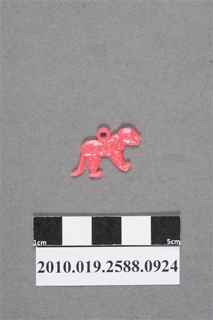 1.本物件為站姿狗型尪仔仙。硬質塑膠材質,扁平,單一不透明粉紅色,雙面浮雕圖案,兩面圖案相同。圖案似狗型,身上有斑點,嘴型似狗式口吻,有尾巴和腿,但不見耳朵。背上有小吊環。2.尪仔仙尺寸大致可分成小、中、大型,小型約長2-5公分,中型約長8-15公分,顏色以單色為主。有些大型的則可長達30公分左右,以菩薩、神仙和民間傳說故事人物等造型為主,塗上金銀紅黃彩漆等亮色。1960、70年代的尪仔仙多以民間傳說故事、歌仔戲、布袋戲人物為造型。1980年代改以卡通、電玩、漫畫人物造型為主。常見玩法之一為兩人(或多人)各持一只尪仔仙,輪流用手指彈射,看誰的尪仔仙先疊在對方上面,便可贏得對方用來對戰或是約定的尪仔仙。