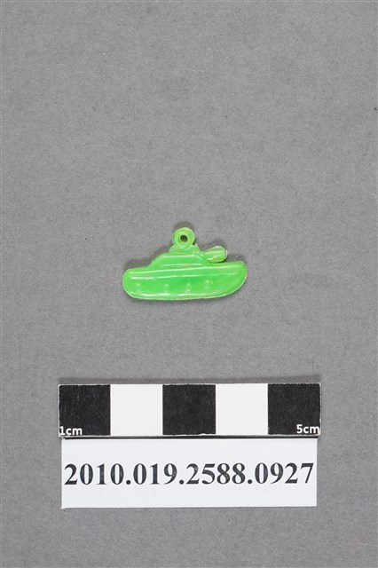 1.本物件為坦克車尪仔仙。硬質塑膠材質,扁平,單一不透明綠色,雙面浮雕圖案,兩面圖案相同。圖案為坦克車側面,可見大砲管和履帶。車頂有小吊環。2.尪仔仙尺寸大致可分成小、中、大型,小型約長2-5公分,中型約長8-15公分,顏色以單色為主。有些大型的則可長達30公分左右,以菩薩、神仙和民間傳說故事人物等造型為主,塗上金銀紅黃彩漆等亮色。1960、70年代的尪仔仙多以民間傳說故事、歌仔戲、布袋戲人物為造型。1980年代改以卡通、電玩、漫畫人物造型為主。常見玩法之一為兩人(或多人)各持一只尪仔仙,輪流用手指彈射,看誰的尪仔仙先疊在對方上面,便可贏得對方用來對戰或是約定的尪仔仙。