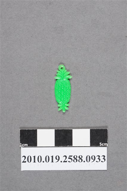 1.本物件為鳳梨尪仔仙。硬質塑膠材質,扁平,單一不透明綠色,雙面浮雕圖案。圖案為下方有果柄,上方有冠芽的鳳梨,可見表面呈菱格紋的果實。冠芽上有小吊環。2.尪仔仙尺寸大致可分成小、中、大型,小型約長2-5公分,中型約長8-15公分,顏色以單色為主。有些大型的則可長達30公分左右,以菩薩、神仙和民間傳說故事人物等造型為主,塗上金銀紅黃彩漆等亮色。1960、70年代的尪仔仙多以民間傳說故事、歌仔戲、布袋戲人物為造型。1980年代改以卡通、電玩、漫畫人物造型為主。常見玩法之一為兩人(或多人)各持一只尪仔仙,輪流用手指彈射,看誰的尪仔仙先疊在對方上面,便可贏得對方用來對戰或是約定的尪仔仙。