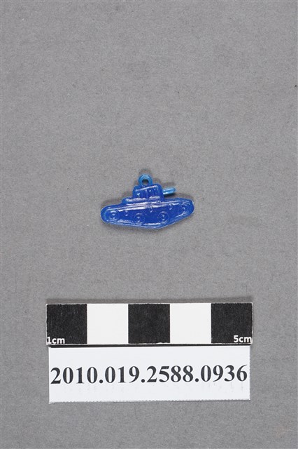 1.本物件為坦克車尪仔仙。硬質塑膠材質,扁平,單一不透明藍色,雙面浮雕圖案,兩面圖案相同。圖案為坦克車側面,可見大砲管和履帶。車頂有小吊環。2.尪仔仙尺寸大致可分成小、中、大型,小型約長2-5公分,中型約長8-15公分,顏色以單色為主。有些大型的則可長達30公分左右,以菩薩、神仙和民間傳說故事人物等造型為主,塗上金銀紅黃彩漆等亮色。1960、70年代的尪仔仙多以民間傳說故事、歌仔戲、布袋戲人物為造型。1980年代改以卡通、電玩、漫畫人物造型為主。常見玩法之一為兩人(或多人)各持一只尪仔仙,輪流用手指彈射,看誰的尪仔仙先疊在對方上面,便可贏得對方用來對戰或是約定的尪仔仙。