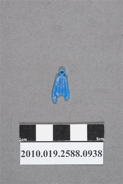 1.本物件為藍色尪仔仙。硬質塑膠材質,扁平,單一不透明藍色,雙面浮雕圖案,兩面圖案相同。無法判斷圖案為何,表面有條狀紋路。有小吊環。2.尪仔仙尺寸大致可分成小、中、大型,小型約長2-5公分,中型約長8-15公分,顏色以單色為主。有些大型的則可長達30公分左右,以菩薩、神仙和民間傳說故事人物等造型為主,塗上金銀紅黃彩漆等亮色。1960、70年代的尪仔仙多以民間傳說故事、歌仔戲、布袋戲人物為造型。1980年代改以卡通、電玩、漫畫人物造型為主。常見玩法之一為兩人(或多人)各持一只尪仔仙,輪流用手指彈射,看誰的尪仔仙先疊在對方上面,便可贏得對方用來對戰或是約定的尪仔仙。