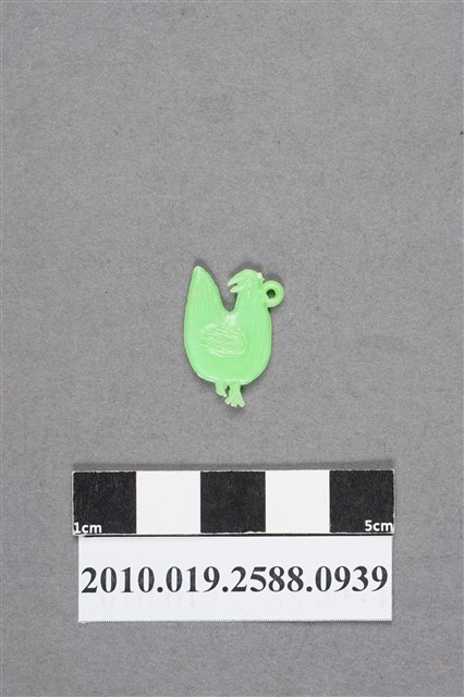 1.本物件為雞尪仔仙。硬質塑膠材質,扁平,單一不透明綠色,雙面浮雕圖案,兩面圖案相同。圖案為站立的雞,頭往後轉,翅膀收起。有小吊環。2.尪仔仙尺寸大致可分成小、中、大型,小型約長2-5公分,中型約長8-15公分,顏色以單色為主。有些大型的則可長達30公分左右,以菩薩、神仙和民間傳說故事人物等造型為主,塗上金銀紅黃彩漆等亮色。1960、70年代的尪仔仙多以民間傳說故事、歌仔戲、布袋戲人物為造型。1980年代改以卡通、電玩、漫畫人物造型為主。常見玩法之一為兩人(或多人)各持一只尪仔仙,輪流用手指彈射,看誰的尪仔仙先疊在對方上面,便可贏得對方用來對戰或是約定的尪仔仙。