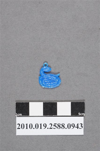 1.本物件為蛇尪仔仙。硬質塑膠材質,扁平,單一不透明藍色,雙面浮雕圖案,兩面圖案相同。圖案為身體蜷曲成圈狀的蛇,蛇頭立起,身體有鱗片。頭頂有小吊環。2.尪仔仙尺寸大致可分成小、中、大型,小型約長2-5公分,中型約長8-15公分,顏色以單色為主。有些大型的則可長達30公分左右,以菩薩、神仙和民間傳說故事人物等造型為主,塗上金銀紅黃彩漆等亮色。1960、70年代的尪仔仙多以民間傳說故事、歌仔戲、布袋戲人物為造型。1980年代改以卡通、電玩、漫畫人物造型為主。常見玩法之一為兩人(或多人)各持一只尪仔仙,輪流用手指彈射,看誰的尪仔仙先疊在對方上面,便可贏得對方用來對戰或是約定的尪仔仙。