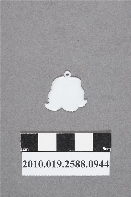 1.本物件為女性頭像尪仔仙。硬質塑膠材質,扁平,單一不透明白色,單面浮雕圖案。正面圖案為女性斜側面,髮型微捲,髮尾翹起,臉上無特殊表情。頭頂上有小吊環。2.尪仔仙尺寸大致可分成小、中、大型,小型約長2-5公分,中型約長8-15公分,顏色以單色為主。有些大型的則可長達30公分左右,以菩薩、神仙和民間傳說故事人物等造型為主,塗上金銀紅黃彩漆等亮色。1960、70年代的尪仔仙多以民間傳說故事、歌仔戲、布袋戲人物為造型。1980年代改以卡通、電玩、漫畫人物造型為主。常見玩法之一為兩人(或多人)各持一只尪仔仙,輪流用手指彈射,看誰的尪仔仙先疊在對方上面,便可贏得對方用來對戰或是約定的尪仔仙。