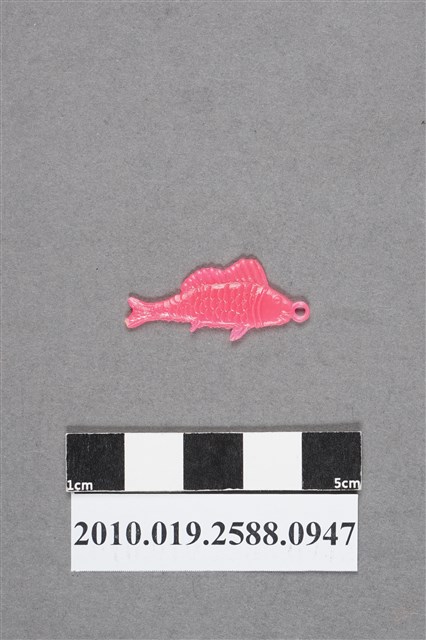 1.本物件為小魚尪仔仙。硬質塑膠材質,扁平,單一不透明粉紅色,雙面浮雕圖案,兩面圖案相同。圖案為鰭形狀特殊的魚,背鰭長,略有波浪狀,有一些胸鰭和腹鰭,身上有鱗片。有小吊環。2.尪仔仙尺寸大致可分成小、中、大型,小型約長2-5公分,中型約長8-15公分,顏色以單色為主。有些大型的則可長達30公分左右,以菩薩、神仙和民間傳說故事人物等造型為主,塗上金銀紅黃彩漆等亮色。1960、70年代的尪仔仙多以民間傳說故事、歌仔戲、布袋戲人物為造型。1980年代改以卡通、電玩、漫畫人物造型為主。常見玩法之一為兩人(或多人)各持一只尪仔仙,輪流用手指彈射,看誰的尪仔仙先疊在對方上面,便可贏得對方用來對戰或是約定的尪仔仙。