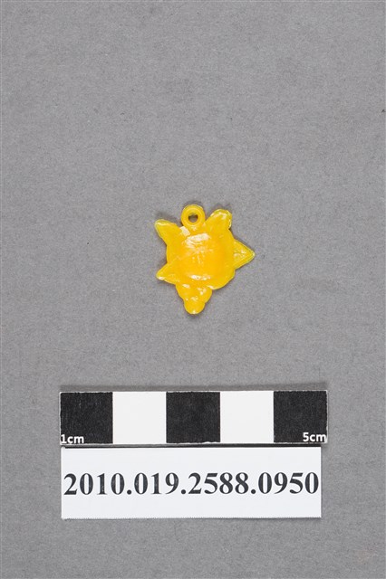 1.本物件為花朵尪仔仙。硬質塑膠材質,扁平,單一不透明黃色,雙面浮雕圖案,兩面圖案相同。圖案為有花萼的花朵,中間有花蕊,周圍有4片花瓣。有小吊環。2.尪仔仙尺寸大致可分成小、中、大型,小型約長2-5公分,中型約長8-15公分,顏色以單色為主。有些大型的則可長達30公分左右,以菩薩、神仙和民間傳說故事人物等造型為主,塗上金銀紅黃彩漆等亮色。1960、70年代的尪仔仙多以民間傳說故事、歌仔戲、布袋戲人物為造型。1980年代改以卡通、電玩、漫畫人物造型為主。常見玩法之一為兩人(或多人)各持一只尪仔仙,輪流用手指彈射,看誰的尪仔仙先疊在對方上面,便可贏得對方用來對戰或是約定的尪仔仙。