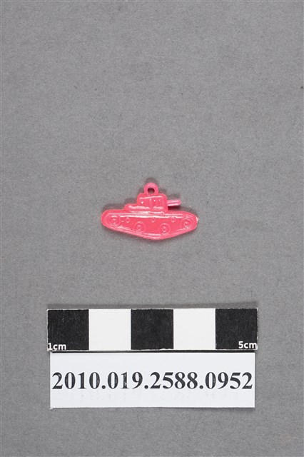 1.本物件為坦克車尪仔仙。硬質塑膠材質,扁平,單一不透明粉紅色,雙面浮雕圖案,兩面圖案相同。圖案為坦克車側面,可見大砲管和履帶。車頂有小吊環。2.尪仔仙尺寸大致可分成小、中、大型,小型約長2-5公分,中型約長8-15公分,顏色以單色為主。有些大型的則可長達30公分左右,以菩薩、神仙和民間傳說故事人物等造型為主,塗上金銀紅黃彩漆等亮色。1960、70年代的尪仔仙多以民間傳說故事、歌仔戲、布袋戲人物為造型。1980年代改以卡通、電玩、漫畫人物造型為主。常見玩法之一為兩人(或多人)各持一只尪仔仙,輪流用手指彈射,看誰的尪仔仙先疊在對方上面,便可贏得對方用來對戰或是約定的尪仔仙。