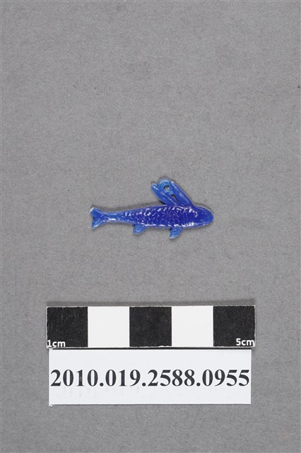 1.本物件為小魚尪仔仙。硬質塑膠材質,扁平,單一不透明藍色,雙面浮雕圖案,兩面圖案相同。圖案為身材細長的魚,有胸、腹、背和尾鰭,有2片背鰭,身上有鱗片。有小吊環。2.尪仔仙尺寸大致可分成小、中、大型,小型約長2-5公分,中型約長8-15公分,顏色以單色為主。有些大型的則可長達30公分左右,以菩薩、神仙和民間傳說故事人物等造型為主,塗上金銀紅黃彩漆等亮色。1960、70年代的尪仔仙多以民間傳說故事、歌仔戲、布袋戲人物為造型。1980年代改以卡通、電玩、漫畫人物造型為主。常見玩法之一為兩人(或多人)各持一只尪仔仙,輪流用手指彈射,看誰的尪仔仙先疊在對方上面,便可贏得對方用來對戰或是約定的尪仔仙。
