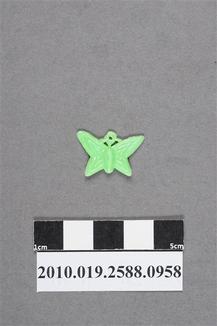 1.本物件為蝴蝶尪仔仙。硬質塑膠材質,扁平,單一不透明綠色,雙面浮雕圖案,兩面圖案相同。圖案為張開翅膀的蝴蝶,軀幹上有橫條紋和觸角。有小吊環。2.尪仔仙尺寸大致可分成小、中、大型,小型約長2-5公分,中型約長8-15公分,顏色以單色為主。有些大型的則可長達30公分左右,以菩薩、神仙和民間傳說故事人物等造型為主,塗上金銀紅黃彩漆等亮色。1960、70年代的尪仔仙多以民間傳說故事、歌仔戲、布袋戲人物為造型。1980年代改以卡通、電玩、漫畫人物造型為主。常見玩法之一為兩人(或多人)各持一只尪仔仙,輪流用手指彈射,看誰的尪仔仙先疊在對方上面,便可贏得對方用來對戰或是約定的尪仔仙。