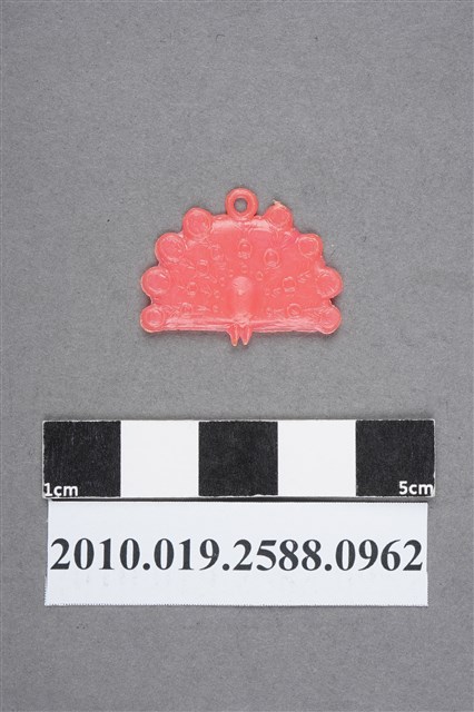 1.本物件為孔雀尪仔仙。硬質塑膠材質,扁平,單一不透明粉紅色,雙面浮雕圖案。正面圖案為羽毛開屏呈半圓形狀的孔雀。有小吊環。2.尪仔仙尺寸大致可分成小、中、大型,小型約長2-5公分,中型約長8-15公分,顏色以單色為主。有些大型的則可長達30公分左右,以菩薩、神仙和民間傳說故事人物等造型為主,塗上金銀紅黃彩漆等亮色。1960、70年代的尪仔仙多以民間傳說故事、歌仔戲、布袋戲人物為造型。1980年代改以卡通、電玩、漫畫人物造型為主。常見玩法之一為兩人(或多人)各持一只尪仔仙,輪流用手指彈射,看誰的尪仔仙先疊在對方上面,便可贏得對方用來對戰或是約定的尪仔仙。
