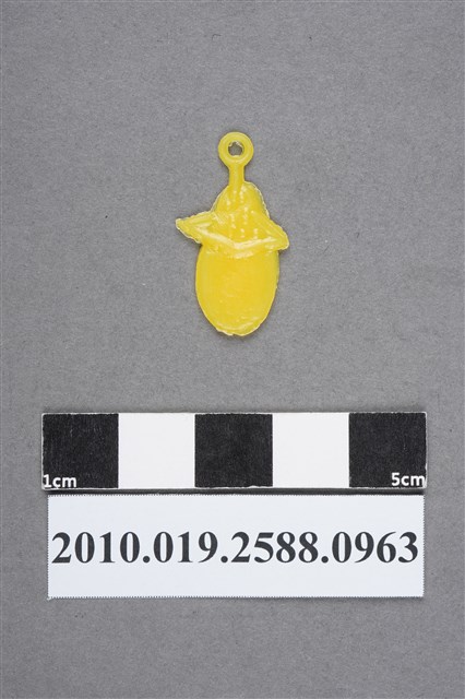 1.本物件為玉米尪仔仙(玉蜀黍)。硬質塑膠材質,扁平,單一不透明黃色,雙面浮雕圖案,兩面圖案相同。圖案為有包葉的玉米,上半截可見玉米顆粒,下半截被葉子包起來。有小吊環。2.尪仔仙尺寸大致可分成小、中、大型,小型約長2-5公分,中型約長8-15公分,顏色以單色為主。有些大型的則可長達30公分左右,以菩薩、神仙和民間傳說故事人物等造型為主,塗上金銀紅黃彩漆等亮色。1960、70年代的尪仔仙多以民間傳說故事、歌仔戲、布袋戲人物為造型。1980年代改以卡通、電玩、漫畫人物造型為主。常見玩法之一為兩人(或多人)各持一只尪仔仙,輪流用手指彈射,看誰的尪仔仙先疊在對方上面,便可贏得對方用來對戰或是約定的尪仔仙。