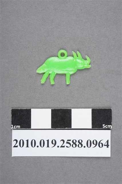 1.本物件為綠色牛型尪仔仙。硬質塑膠材質,扁平,單一不透明綠色,雙面浮雕圖案,兩面圖案相同。圖案似站立的牛隻,耳朵或頭角豎起,嘴型奇怪,僅見3隻腳。背上有小吊環。2.尪仔仙尺寸大致可分成小、中、大型,小型約長2-5公分,中型約長8-15公分,顏色以單色為主。有些大型的則可長達30公分左右,以菩薩、神仙和民間傳說故事人物等造型為主,塗上金銀紅黃彩漆等亮色。1960、70年代的尪仔仙多以民間傳說故事、歌仔戲、布袋戲人物為造型。1980年代改以卡通、電玩、漫畫人物造型為主。常見玩法之一為兩人(或多人)各持一只尪仔仙,輪流用手指彈射,看誰的尪仔仙先疊在對方上面,便可贏得對方用來對戰或是約定的尪仔仙。