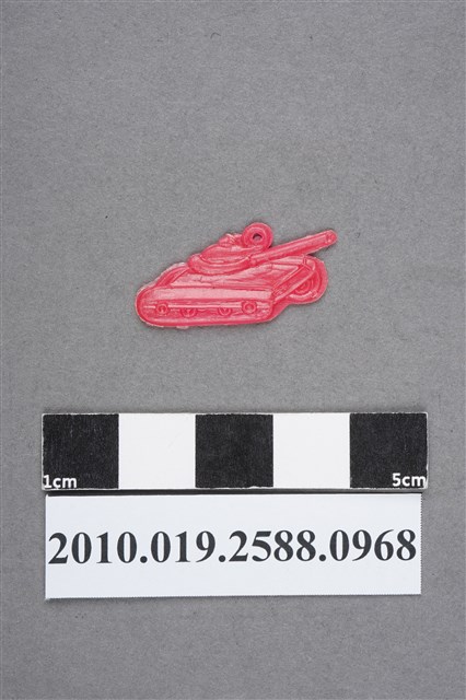 1.本物件為坦克車尪仔仙。硬質塑膠材質,扁平,單一不透明粉紅色,雙面浮雕圖案,兩面圖案相同。圖案為坦克車斜側面,可見大砲管、履帶以及車頭部位。車頂有小吊環。2.尪仔仙尺寸大致可分成小、中、大型,小型約長2-5公分,中型約長8-15公分,顏色以單色為主。有些大型的則可長達30公分左右,以菩薩、神仙和民間傳說故事人物等造型為主,塗上金銀紅黃彩漆等亮色。1960、70年代的尪仔仙多以民間傳說故事、歌仔戲、布袋戲人物為造型。1980年代改以卡通、電玩、漫畫人物造型為主。常見玩法之一為兩人(或多人)各持一只尪仔仙,輪流用手指彈射,看誰的尪仔仙先疊在對方上面,便可贏得對方用來對戰或是約定的尪仔仙。