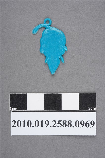 1.本物件為鬍子頭像尪仔仙。硬質塑膠材質,扁平,單一不透明藍色,單面浮雕圖案。正面圖案為男性頭像,長眉,上嘴唇有兩撇長鬍子,下巴有一撮鬍子,頭頂上綁有一束頭髮。有小吊環。