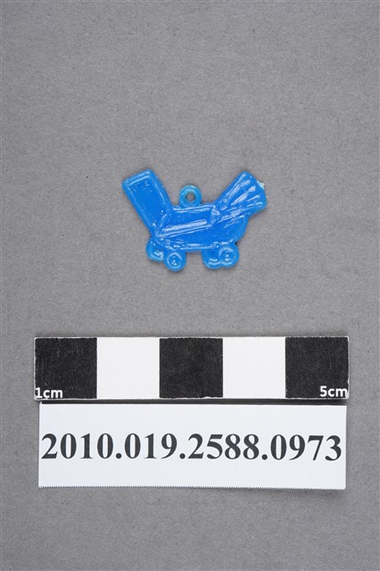 1.本物件為嬰兒推車尪仔仙。硬質塑膠材質,扁平,單一不透明藍色,雙面浮雕圖案,兩面圖案相同。圖案為有折疊式棚頂的嬰兒推車,有4個輪子,立起來呈方型之處為推車把手。有小吊環。2.尪仔仙尺寸大致可分成小、中、大型,小型約長2-5公分,中型約長8-15公分,顏色以單色為主。有些大型的則可長達30公分左右,以菩薩、神仙和民間傳說故事人物等造型為主,塗上金銀紅黃彩漆等亮色。1960、70年代的尪仔仙多以民間傳說故事、歌仔戲、布袋戲人物為造型。1980年代改以卡通、電玩、漫畫人物造型為主。常見玩法之一為兩人(或多人)各持一只尪仔仙,輪流用手指彈射,看誰的尪仔仙先疊在對方上面,便可贏得對方用來對戰或是約定的尪仔仙。