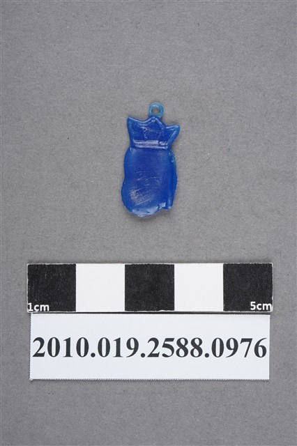 1.本物件為和尚頭像尪仔仙。硬質塑膠材質,扁平,單一不透明藍色,雙面浮雕圖案。正面圖案為頭戴五佛冠和毘盧帽的和尚頭像,耳朵比例大,耳垂碩大。帽頂有小吊環。