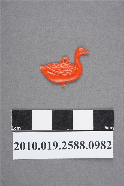 1.本物件為鵝尪仔仙。硬質塑膠材質,扁平,單一不透明橘紅色,雙面浮雕圖案,兩面圖案相同。圖案為鵝隻側面,喙短尖,翅膀收在身旁,腳著地。背上有小吊環。2.尪仔仙尺寸大致可分成小、中、大型,小型約長2-5公分,中型約長8-15公分,顏色以單色為主。有些大型的則可長達30公分左右,以菩薩、神仙和民間傳說故事人物等造型為主,塗上金銀紅黃彩漆等亮色。1960、70年代的尪仔仙多以民間傳說故事、歌仔戲、布袋戲人物為造型。1980年代改以卡通、電玩、漫畫人物造型為主。常見玩法之一為兩人(或多人)各持一只尪仔仙,輪流用手指彈射,看誰的尪仔仙先疊在對方上面,便可贏得對方用來對戰或是約定的尪仔仙。