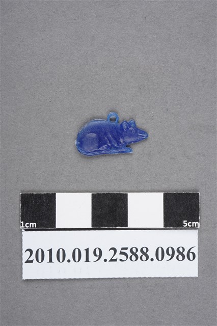 1.本物件為老鼠尪仔仙。硬質塑膠材質,扁平,單一不透明藍色,雙面浮雕圖案,兩面圖案相同。圖案為趴在地上的老鼠,其尾巴縮在身邊。背上有小吊環。2.尪仔仙尺寸大致可分成小、中、大型,小型約長2-5公分,中型約長8-15公分,顏色以單色為主。有些大型的則可長達30公分左右,以菩薩、神仙和民間傳說故事人物等造型為主,塗上金銀紅黃彩漆等亮色。1960、70年代的尪仔仙多以民間傳說故事、歌仔戲、布袋戲人物為造型。1980年代改以卡通、電玩、漫畫人物造型為主。常見玩法之一為兩人(或多人)各持一只尪仔仙,輪流用手指彈射,看誰的尪仔仙先疊在對方上面,便可贏得對方用來對戰或是約定的尪仔仙。