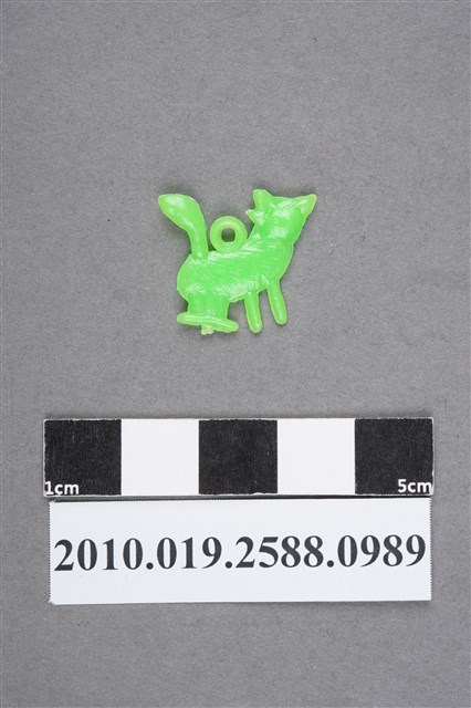 1.本物件為坐姿狗型尪仔仙。硬質塑膠材質,扁平,單一不透明綠色,雙面浮雕圖案。圖案似前腳立起,後腳呈坐姿的狗型動物,難以辨識臉部表情,尾巴翹起。頭頂有小吊環。2.尪仔仙尺寸大致可分成小、中、大型,小型約長2-5公分,中型約長8-15公分,顏色以單色為主。有些大型的則可長達30公分左右,以菩薩、神仙和民間傳說故事人物等造型為主,塗上金銀紅黃彩漆等亮色。1960、70年代的尪仔仙多以民間傳說故事、歌仔戲、布袋戲人物為造型。1980年代改以卡通、電玩、漫畫人物造型為主。常見玩法之一為兩人(或多人)各持一只尪仔仙,輪流用手指彈射,看誰的尪仔仙先疊在對方上面,便可贏得對方用來對戰或是約定的尪仔仙。