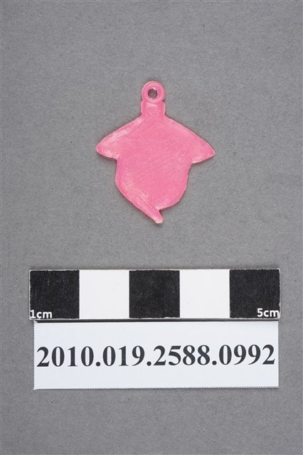 1.本物件為戴帽頭像尪仔仙。硬質塑膠材質,扁平,單一不透明粉紅色,單面浮雕圖案。正面圖案為戴著帽子的頭像,有眼睛、鼻子和嘴巴,帽形似斗笠,下巴處有斜角。帽頂上有小吊環。2.尪仔仙尺寸大致可分成小、中、大型,小型約長2-5公分,中型約長8-15公分,顏色以單色為主。有些大型的則可長達30公分左右,以菩薩、神仙和民間傳說故事人物等造型為主,塗上金銀紅黃彩漆等亮色。1960、70年代的尪仔仙多以民間傳說故事、歌仔戲、布袋戲人物為造型。1980年代改以卡通、電玩、漫畫人物造型為主。常見玩法之一為兩人(或多人)各持一只尪仔仙,輪流用手指彈射,看誰的尪仔仙先疊在對方上面,便可贏得對方用來對戰或是約定的尪仔仙。