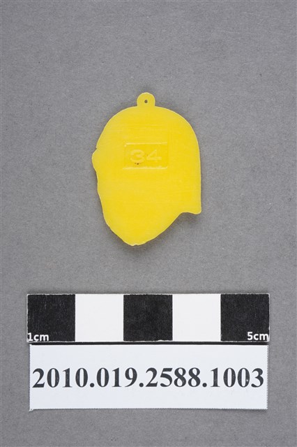 1.本物件為怪物頭像尪仔仙。硬質塑膠材質,扁平,單一不透明黃色,單面浮雕圖案。正面圖案為大嘴笑且露出牙齒的怪物頭像,眼眶明顯,皮膚布滿小顆粒。頭頂有小吊環,背面有34之陽刻字樣,是系列尪仔仙。2.尪仔仙尺寸大致可分成小、中、大型,小型約長2-5公分,中型約長8-15公分,顏色以單色為主。有些大型的則可長達30公分左右,以菩薩、神仙和民間傳說故事人物等造型為主,塗上金銀紅黃彩漆等亮色。1960、70年代的尪仔仙多以民間傳說故事、歌仔戲、布袋戲人物為造型。1980年代改以卡通、電玩、漫畫人物造型為主。常見玩法之一為兩人(或多人)各持一只尪仔仙,輪流用手指彈射,看誰的尪仔仙先疊在對方上面,便可贏得對方用來對戰或是約定的尪仔仙。