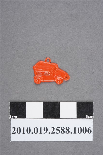 1.本物件為汽車尪仔仙。硬質塑膠材質,扁平,單一不透明橘紅色,雙面浮雕圖案,兩面圖案相同。圖案為沒有後車箱的汽車,車廂方正,為復古車型。車頂有小吊環。2.尪仔仙尺寸大致可分成小、中、大型,小型約長2-5公分,中型約長8-15公分,顏色以單色為主。有些大型的則可長達30公分左右,以菩薩、神仙和民間傳說故事人物等造型為主,塗上金銀紅黃彩漆等亮色。1960、70年代的尪仔仙多以民間傳說故事、歌仔戲、布袋戲人物為造型。1980年代改以卡通、電玩、漫畫人物造型為主。常見玩法之一為兩人(或多人)各持一只尪仔仙,輪流用手指彈射,看誰的尪仔仙先疊在對方上面,便可贏得對方用來對戰或是約定的尪仔仙。