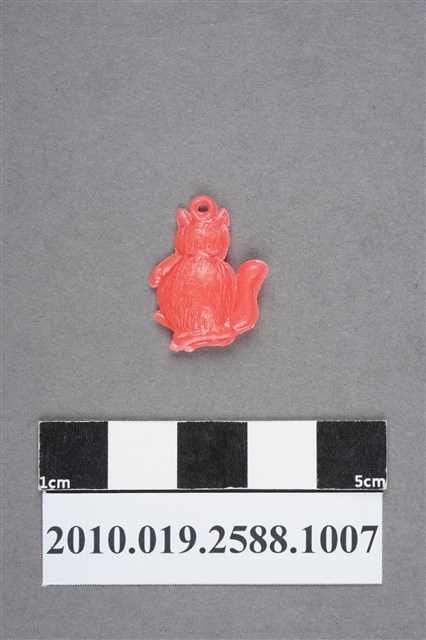 1.本物件為貓咪尪仔仙。硬質塑膠材質,扁平,單一不透明粉紅色,雙面浮雕圖案。正面圖案為身材圓滾呈坐姿的貓咪,肚子大,前肢放於胸前,尾巴翹起。背面有根根貓毛之貌,頭頂有小吊環。2.尪仔仙尺寸大致可分成小、中、大型,小型約長2-5公分,中型約長8-15公分,顏色以單色為主。有些大型的則可長達30公分左右,以菩薩、神仙和民間傳說故事人物等造型為主,塗上金銀紅黃彩漆等亮色。1960、70年代的尪仔仙多以民間傳說故事、歌仔戲、布袋戲人物為造型。1980年代改以卡通、電玩、漫畫人物造型為主。常見玩法之一為兩人(或多人)各持一只尪仔仙,輪流用手指彈射,看誰的尪仔仙先疊在對方上面,便可贏得對方用來對戰或是約定的尪仔仙。