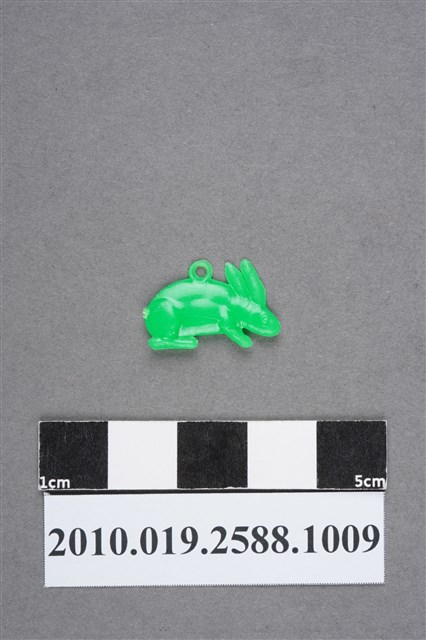 1.本物件為兔子尪仔仙。硬質塑膠材質,扁平,單一不透明綠色,雙面浮雕圖案,兩面圖案相同。圖案為長耳朵的兔子,頭有向前伸出之貌,無尾巴。背上有小吊環。2.尪仔仙尺寸大致可分成小、中、大型,小型約長2-5公分,中型約長8-15公分,顏色以單色為主。有些大型的則可長達30公分左右,以菩薩、神仙和民間傳說故事人物等造型為主,塗上金銀紅黃彩漆等亮色。1960、70年代的尪仔仙多以民間傳說故事、歌仔戲、布袋戲人物為造型。1980年代改以卡通、電玩、漫畫人物造型為主。常見玩法之一為兩人(或多人)各持一只尪仔仙,輪流用手指彈射,看誰的尪仔仙先疊在對方上面,便可贏得對方用來對戰或是約定的尪仔仙。