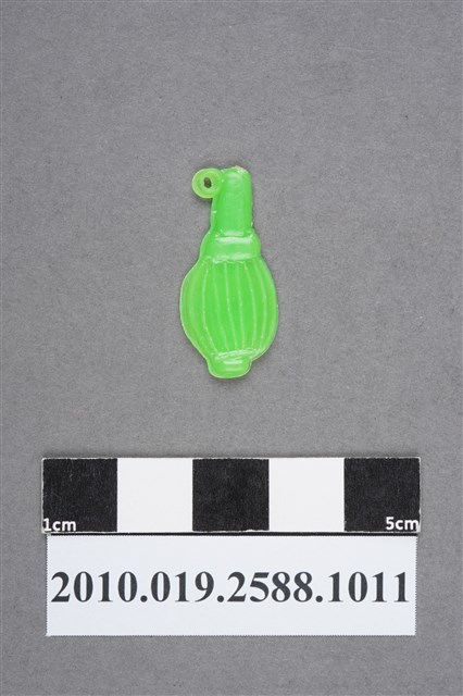 1.本物件為瓶子尪仔仙。硬質塑膠材質,扁平,單一不透明綠色,雙面浮雕圖案,兩面圖案相同。圖案為瓶肚呈圓弧型的瓶子,瓶身表面有直條紋。有小吊環。2.尪仔仙尺寸大致可分成小、中、大型,小型約長2-5公分,中型約長8-15公分,顏色以單色為主。有些大型的則可長達30公分左右,以菩薩、神仙和民間傳說故事人物等造型為主,塗上金銀紅黃彩漆等亮色。1960、70年代的尪仔仙多以民間傳說故事、歌仔戲、布袋戲人物為造型。1980年代改以卡通、電玩、漫畫人物造型為主。常見玩法之一為兩人(或多人)各持一只尪仔仙,輪流用手指彈射,看誰的尪仔仙先疊在對方上面,便可贏得對方用來對戰或是約定的尪仔仙。