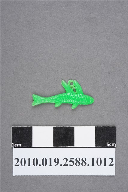 1.本物件為小魚尪仔仙。硬質塑膠材質,扁平,單一不透明綠色,雙面浮雕圖案,兩面圖案相同。圖案為身材細長的魚,有胸、腹、背和尾鰭,有2片背鰭,身上有鱗片。有小吊環。2.尪仔仙尺寸大致可分成小、中、大型,小型約長2-5公分,中型約長8-15公分,顏色以單色為主。有些大型的則可長達30公分左右,以菩薩、神仙和民間傳說故事人物等造型為主,塗上金銀紅黃彩漆等亮色。1960、70年代的尪仔仙多以民間傳說故事、歌仔戲、布袋戲人物為造型。1980年代改以卡通、電玩、漫畫人物造型為主。常見玩法之一為兩人(或多人)各持一只尪仔仙,輪流用手指彈射,看誰的尪仔仙先疊在對方上面,便可贏得對方用來對戰或是約定的尪仔仙。