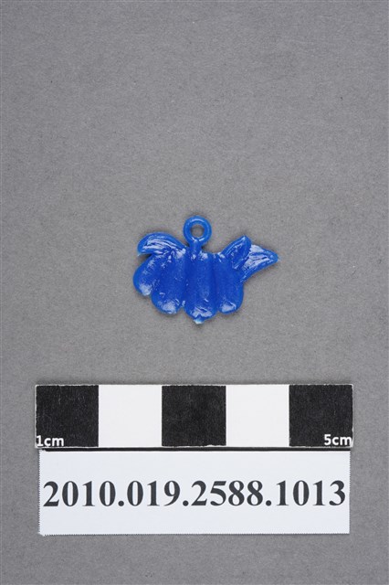 1.本物件為藍色尪仔仙。硬質塑膠材質,扁平,單一不透明藍色,雙面浮雕圖案,兩面圖案相同。難以判斷圖案為何,似一串水果類物品。有小吊環。2.尪仔仙尺寸大致可分成小、中、大型,小型約長2-5公分,中型約長8-15公分,顏色以單色為主。有些大型的則可長達30公分左右,以菩薩、神仙和民間傳說故事人物等造型為主,塗上金銀紅黃彩漆等亮色。1960、70年代的尪仔仙多以民間傳說故事、歌仔戲、布袋戲人物為造型。1980年代改以卡通、電玩、漫畫人物造型為主。常見玩法之一為兩人(或多人)各持一只尪仔仙,輪流用手指彈射,看誰的尪仔仙先疊在對方上面,便可贏得對方用來對戰或是約定的尪仔仙。