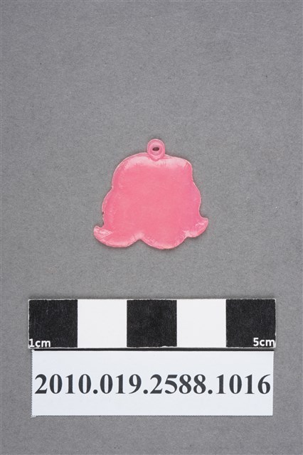 1.本物件為女性頭像尪仔仙。硬質塑膠材質,扁平,單一不透明粉紅色,單面浮雕圖案。正面圖案為女性斜側面,髮型微捲,髮尾翹起,臉上無特殊表情。頭頂上有小吊環。2.尪仔仙尺寸大致可分成小、中、大型,小型約長2-5公分,中型約長8-15公分,顏色以單色為主。有些大型的則可長達30公分左右,以菩薩、神仙和民間傳說故事人物等造型為主,塗上金銀紅黃彩漆等亮色。1960、70年代的尪仔仙多以民間傳說故事、歌仔戲、布袋戲人物為造型。1980年代改以卡通、電玩、漫畫人物造型為主。常見玩法之一為兩人(或多人)各持一只尪仔仙,輪流用手指彈射,看誰的尪仔仙先疊在對方上面,便可贏得對方用來對戰或是約定的尪仔仙。