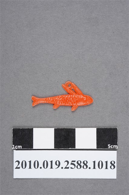 1.本物件為小魚尪仔仙。硬質塑膠材質,扁平,單一不透明橘色,雙面浮雕圖案,兩面圖案相同。圖案為身材細長的魚,有胸、腹、背和尾鰭,有2片背鰭,身上有鱗片。有小吊環。