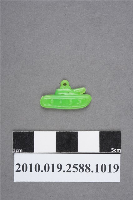 1.本物件為坦克車尪仔仙。硬質塑膠材質,扁平,單一不透明綠色,雙面浮雕圖案,兩面圖案相同。圖案為坦克車側面,可見大砲管和履帶。車頂有小吊環。2.尪仔仙尺寸大致可分成小、中、大型,小型約長2-5公分,中型約長8-15公分,顏色以單色為主。有些大型的則可長達30公分左右,以菩薩、神仙和民間傳說故事人物等造型為主,塗上金銀紅黃彩漆等亮色。1960、70年代的尪仔仙多以民間傳說故事、歌仔戲、布袋戲人物為造型。1980年代改以卡通、電玩、漫畫人物造型為主。常見玩法之一為兩人(或多人)各持一只尪仔仙,輪流用手指彈射,看誰的尪仔仙先疊在對方上面,便可贏得對方用來對戰或是約定的尪仔仙。