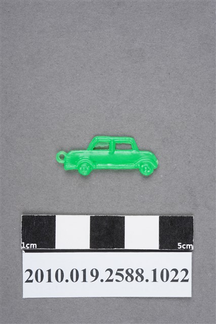 1.本物件為汽車尪仔仙。硬質塑膠材質,扁平,單一不透明綠色,雙面浮雕圖案,兩面圖案相同。圖案為有2格窗戶的汽車側面,窗戶鏤空,側面有2個輪胎。車頭有小吊環。2.尪仔仙尺寸大致可分成小、中、大型,小型約長2-5公分,中型約長8-15公分,顏色以單色為主。有些大型的則可長達30公分左右,以菩薩、神仙和民間傳說故事人物等造型為主,塗上金銀紅黃彩漆等亮色。1960、70年代的尪仔仙多以民間傳說故事、歌仔戲、布袋戲人物為造型。1980年代改以卡通、電玩、漫畫人物造型為主。常見玩法之一為兩人(或多人)各持一只尪仔仙,輪流用手指彈射,看誰的尪仔仙先疊在對方上面,便可贏得對方用來對戰或是約定的尪仔仙。