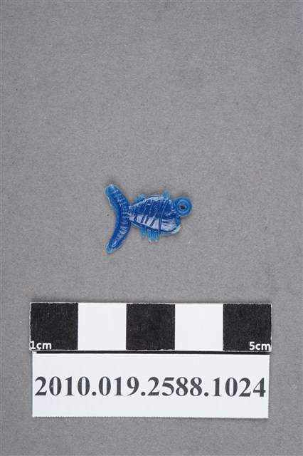 1.本物件為小魚尪仔仙。硬質塑膠材質,扁平,單一不透明藍色,雙面浮雕圖案,兩面圖案相同。圖案為簡易型態的魚,無胸、背和腹鰭,有呈彎月形狀的尾鰭,身上有凸起橫條紋,似魚鱗。有小吊環。2.尪仔仙尺寸大致可分成小、中、大型,小型約長2-5公分,中型約長8-15公分,顏色以單色為主。有些大型的則可長達30公分左右,以菩薩、神仙和民間傳說故事人物等造型為主,塗上金銀紅黃彩漆等亮色。1960、70年代的尪仔仙多以民間傳說故事、歌仔戲、布袋戲人物為造型。1980年代改以卡通、電玩、漫畫人物造型為主。常見玩法之一為兩人(或多人)各持一只尪仔仙,輪流用手指彈射,看誰的尪仔仙先疊在對方上面,便可贏得對方用來對戰或是約定的尪仔仙。