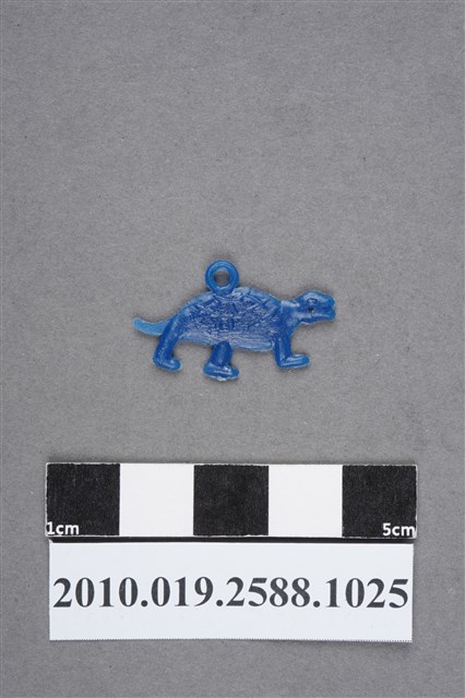 1.本物件為烏龜尪仔仙。硬質塑膠材質,扁平,單一不透明藍色,雙面浮雕圖案,兩面圖案相同。圖案為用3隻腳站立的烏龜,有眼睛、嘴巴和尾巴,龜殼上有花紋。比起正常烏龜體型,腳型略長。背上有小吊環。2.尪仔仙尺寸大致可分成小、中、大型,小型約長2-5公分,中型約長8-15公分,顏色以單色為主。有些大型的則可長達30公分左右,以菩薩、神仙和民間傳說故事人物等造型為主,塗上金銀紅黃彩漆等亮色。1960、70年代的尪仔仙多以民間傳說故事、歌仔戲、布袋戲人物為造型。1980年代改以卡通、電玩、漫畫人物造型為主。常見玩法之一為兩人(或多人)各持一只尪仔仙,輪流用手指彈射,看誰的尪仔仙先疊在對方上面,便可贏得對方用來對戰或是約定的尪仔仙。