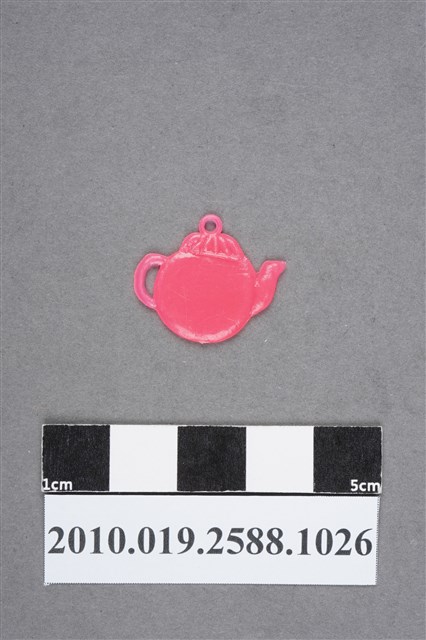 1.本物件為水壺尪仔仙。硬質塑膠材質,扁平,單一不透明粉紅色,雙面浮雕圖案,兩面圖案相同。圖案為圓身水壺,可見壺嘴和把手,壺蓋上有條紋。有小吊環。2.尪仔仙尺寸大致可分成小、中、大型,小型約長2-5公分,中型約長8-15公分,顏色以單色為主。有些大型的則可長達30公分左右,以菩薩、神仙和民間傳說故事人物等造型為主,塗上金銀紅黃彩漆等亮色。1960、70年代的尪仔仙多以民間傳說故事、歌仔戲、布袋戲人物為造型。1980年代改以卡通、電玩、漫畫人物造型為主。常見玩法之一為兩人(或多人)各持一只尪仔仙,輪流用手指彈射,看誰的尪仔仙先疊在對方上面,便可贏得對方用來對戰或是約定的尪仔仙。