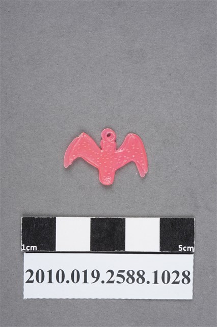 1.本物件為蝙蝠尪仔仙。硬質塑膠材質,扁平,單一不透明粉紅色,雙面浮雕圖案。正面圖案為翅膀向左右張開的蝙蝠。頭頂上有小吊環。2.尪仔仙尺寸大致可分成小、中、大型,小型約長2-5公分,中型約長8-15公分,顏色以單色為主。有些大型的則可長達30公分左右,以菩薩、神仙和民間傳說故事人物等造型為主,塗上金銀紅黃彩漆等亮色。1960、70年代的尪仔仙多以民間傳說故事、歌仔戲、布袋戲人物為造型。1980年代改以卡通、電玩、漫畫人物造型為主。常見玩法之一為兩人(或多人)各持一只尪仔仙,輪流用手指彈射,看誰的尪仔仙先疊在對方上面,便可贏得對方用來對戰或是約定的尪仔仙。
