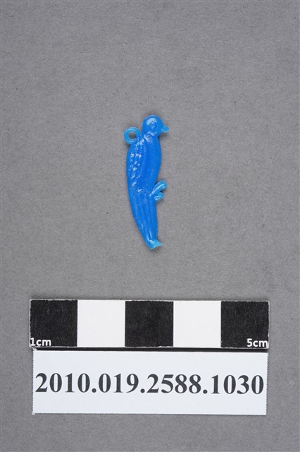 1.本物件為小鳥尪仔仙。硬質塑膠材質,扁平,單一不透明藍色,雙面浮雕圖案。圖案為呈站姿的小鳥側面,翅膀收在身旁,尾巴羽毛長且垂下。有小吊環。2.尪仔仙尺寸大致可分成小、中、大型,小型約長2-5公分,中型約長8-15公分,顏色以單色為主。有些大型的則可長達30公分左右,以菩薩、神仙和民間傳說故事人物等造型為主,塗上金銀紅黃彩漆等亮色。1960、70年代的尪仔仙多以民間傳說故事、歌仔戲、布袋戲人物為造型。1980年代改以卡通、電玩、漫畫人物造型為主。常見玩法之一為兩人(或多人)各持一只尪仔仙,輪流用手指彈射,看誰的尪仔仙先疊在對方上面,便可贏得對方用來對戰或是約定的尪仔仙。