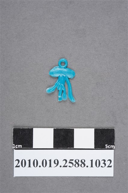 1.本物件為水母尪仔仙。硬質塑膠材質,扁平,單一不透明藍色,雙面浮雕圖案,兩面圖案相同。圖案為水母,可見圓傘狀身體和口腕。有小吊環。2.尪仔仙尺寸大致可分成小、中、大型,小型約長2-5公分,中型約長8-15公分,顏色以單色為主。有些大型的則可長達30公分左右,以菩薩、神仙和民間傳說故事人物等造型為主,塗上金銀紅黃彩漆等亮色。1960、70年代的尪仔仙多以民間傳說故事、歌仔戲、布袋戲人物為造型。1980年代改以卡通、電玩、漫畫人物造型為主。常見玩法之一為兩人(或多人)各持一只尪仔仙,輪流用手指彈射,看誰的尪仔仙先疊在對方上面,便可贏得對方用來對戰或是約定的尪仔仙。