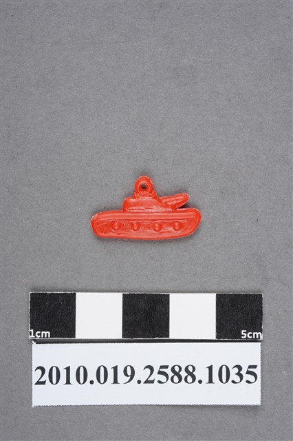 1.本物件為坦克車尪仔仙。硬質塑膠材質,扁平,單一不透明橘紅色,雙面浮雕圖案,兩面圖案相同。圖案為坦克車側面,可見大砲管和履帶。車頂有小吊環。2.尪仔仙尺寸大致可分成小、中、大型,小型約長2-5公分,中型約長8-15公分,顏色以單色為主。有些大型的則可長達30公分左右,以菩薩、神仙和民間傳說故事人物等造型為主,塗上金銀紅黃彩漆等亮色。1960、70年代的尪仔仙多以民間傳說故事、歌仔戲、布袋戲人物為造型。1980年代改以卡通、電玩、漫畫人物造型為主。常見玩法之一為兩人(或多人)各持一只尪仔仙,輪流用手指彈射,看誰的尪仔仙先疊在對方上面,便可贏得對方用來對戰或是約定的尪仔仙。