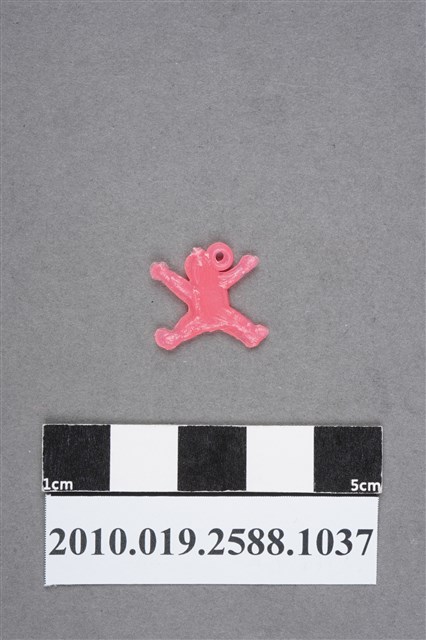 1.本物件為大字人型尪仔仙。硬質塑膠材質,扁平,單一不透明粉紅色,單面浮雕圖案。正面圖案為雙手往上舉,雙腳打開的人型,呈現大字型的樣子,可見衣服上有3顆扣子。有小吊環。