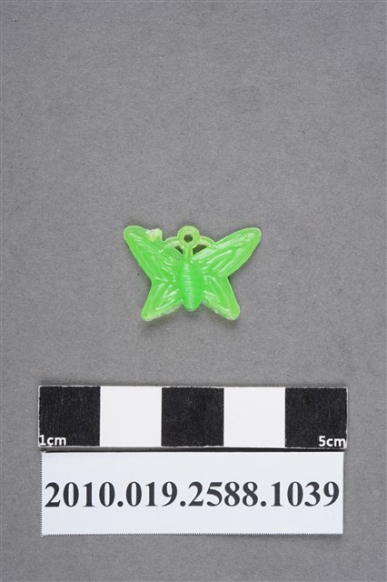 1.本物件為蝴蝶尪仔仙。硬質塑膠材質,扁平,單一不透明綠色,雙面浮雕圖案,兩面圖案相同。圖案為張開翅膀的蝴蝶,軀幹上有橫條紋和觸角。有小吊環。2.尪仔仙尺寸大致可分成小、中、大型,小型約長2-5公分,中型約長8-15公分,顏色以單色為主。有些大型的則可長達30公分左右,以菩薩、神仙和民間傳說故事人物等造型為主,塗上金銀紅黃彩漆等亮色。1960、70年代的尪仔仙多以民間傳說故事、歌仔戲、布袋戲人物為造型。1980年代改以卡通、電玩、漫畫人物造型為主。常見玩法之一為兩人(或多人)各持一只尪仔仙,輪流用手指彈射,看誰的尪仔仙先疊在對方上面,便可贏得對方用來對戰或是約定的尪仔仙。