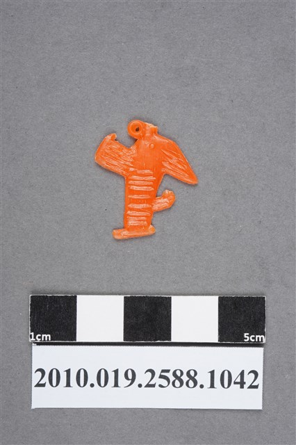 1.本物件為橘色尪仔仙。硬質塑膠材質,扁平,單一不透明橘色,雙面浮雕圖案,兩面圖案相同。無法判斷圖案為何,呈不規則形狀,表面有橫條紋。有小吊環。2.尪仔仙尺寸大致可分成小、中、大型,小型約長2-5公分,中型約長8-15公分,顏色以單色為主。有些大型的則可長達30公分左右,以菩薩、神仙和民間傳說故事人物等造型為主,塗上金銀紅黃彩漆等亮色。1960、70年代的尪仔仙多以民間傳說故事、歌仔戲、布袋戲人物為造型。1980年代改以卡通、電玩、漫畫人物造型為主。常見玩法之一為兩人(或多人)各持一只尪仔仙,輪流用手指彈射,看誰的尪仔仙先疊在對方上面,便可贏得對方用來對戰或是約定的尪仔仙。