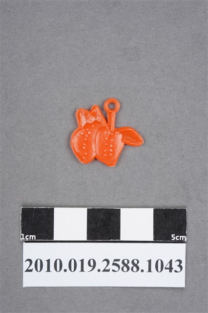 1.本物件為草莓尪仔仙。硬質塑膠材質,扁平,單一不透明橘紅色,雙面浮雕圖案,兩面圖案略同。圖案為2顆草莓,有3片葉子,表面有點狀圖案,兩面的點狀圖案分布不同。有小吊環。2.尪仔仙尺寸大致可分成小、中、大型,小型約長2-5公分,中型約長8-15公分,顏色以單色為主。有些大型的則可長達30公分左右,以菩薩、神仙和民間傳說故事人物等造型為主,塗上金銀紅黃彩漆等亮色。1960、70年代的尪仔仙多以民間傳說故事、歌仔戲、布袋戲人物為造型。1980年代改以卡通、電玩、漫畫人物造型為主。常見玩法之一為兩人(或多人)各持一只尪仔仙,輪流用手指彈射,看誰的尪仔仙先疊在對方上面,便可贏得對方用來對戰或是約定的尪仔仙。