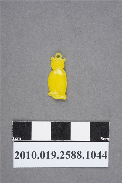 1.本物件為貓咪尪仔仙。硬質塑膠材質,扁平,單一不透明黃色,單面浮雕圖案。正面圖案為坐著的貓咪,上肢放於胸前,下肢接觸地面,右腳往前擺。頭頂有小吊環。2.尪仔仙尺寸大致可分成小、中、大型,小型約長2-5公分,中型約長8-15公分,顏色以單色為主。有些大型的則可長達30公分左右,以菩薩、神仙和民間傳說故事人物等造型為主,塗上金銀紅黃彩漆等亮色。1960、70年代的尪仔仙多以民間傳說故事、歌仔戲、布袋戲人物為造型。1980年代改以卡通、電玩、漫畫人物造型為主。常見玩法之一為兩人(或多人)各持一只尪仔仙,輪流用手指彈射,看誰的尪仔仙先疊在對方上面,便可贏得對方用來對戰或是約定的尪仔仙。