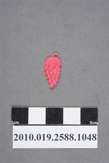 1.本物件為葡萄尪仔仙。硬質塑膠材質,扁平,單一不透明粉紅色,雙面浮雕圖案,兩面圖案相同。圖案為1串葡萄,有3片葉子披在果實上,果實粒粒分明。有小吊環。2.尪仔仙尺寸大致可分成小、中、大型,小型約長2-5公分,中型約長8-15公分,顏色以單色為主。有些大型的則可長達30公分左右,以菩薩、神仙和民間傳說故事人物等造型為主,塗上金銀紅黃彩漆等亮色。1960、70年代的尪仔仙多以民間傳說故事、歌仔戲、布袋戲人物為造型。1980年代改以卡通、電玩、漫畫人物造型為主。常見玩法之一為兩人(或多人)各持一只尪仔仙,輪流用手指彈射,看誰的尪仔仙先疊在對方上面,便可贏得對方用來對戰或是約定的尪仔仙。